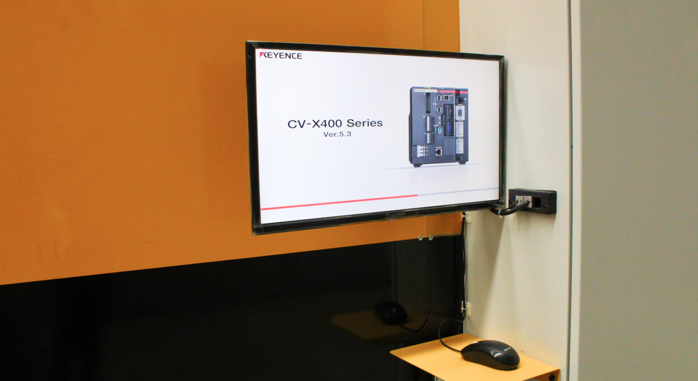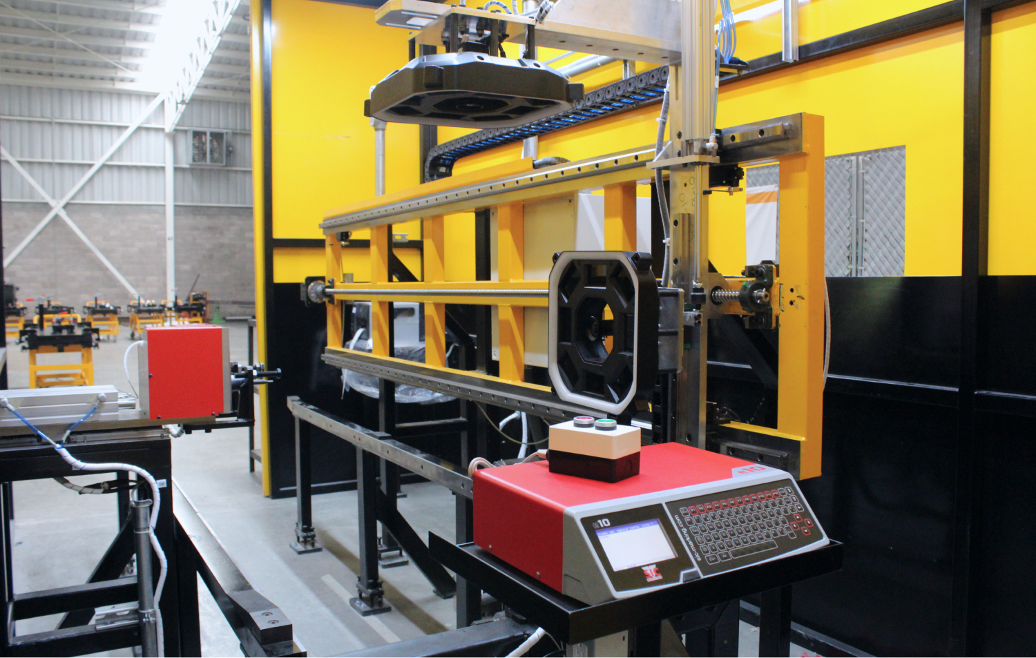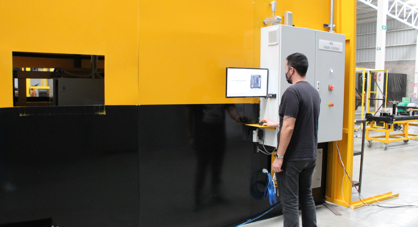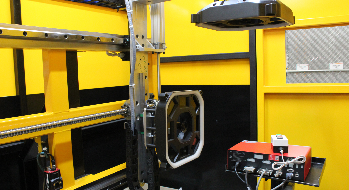 Además, está integrado con dos cámaras de visión 3d marca Keyence montadas sobre un sistema de guías lineales marca THK y accionadas por un servomotor marca Mitsubishi modelo HG-KR23K y tornillo de bolas marca Sic Marking.